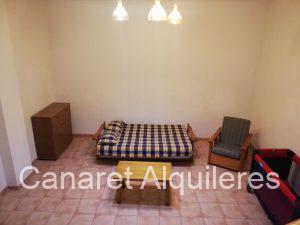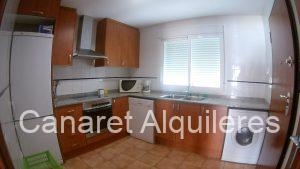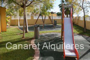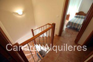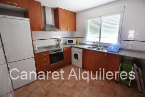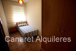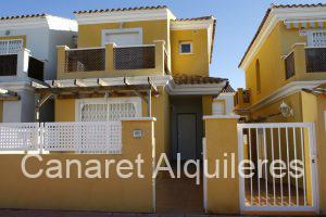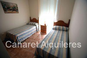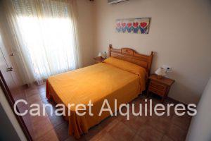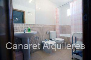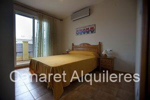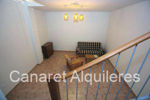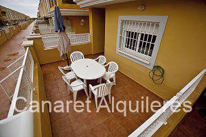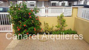 Chalet adosado con 3 plantas y 2 plazas de garaje. Planta baja. Terraza – jardín a pie de calle, con toldo. Recibidor, aseo con ducha y salón-comedor con mesa para 8 personas. Amplia cocina independiente desde la que se accede a otra terraza y al interior de la urbanización. La terraza dispone de mesa y 8 sillas. Cuenta con toldo para protegerse del sol. Planta 1ª Dormitorio de matrimonio con acceso a terraza privada, una habitación con 2 camas, y otra individual. Todas ellas cuentan con armario empotrado. Baño completo con bañera. Planta semi-sótano Espacio muy amplio de 30 m2, con sofá-cama, cama plegable y armario. Desde aquí se accede, a través de dos puertas de seguridad, al garaje.
