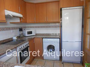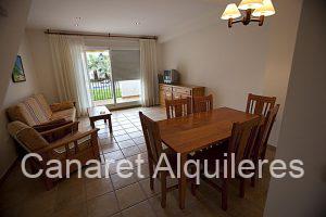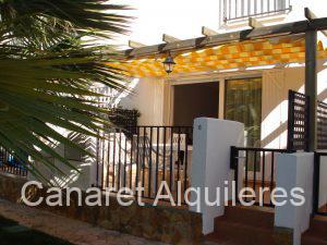 A pie de calle hay una terraza garaje-jardín, descubierta. Recibidor, cocina independiente, aseo con ducha y salón-comedor con sofá-cama para 2 personas y mesa para 6/7 personas. También hay una terraza con mesa y seis sillas con acceso a la piscina. La terraza dispone de toldo.